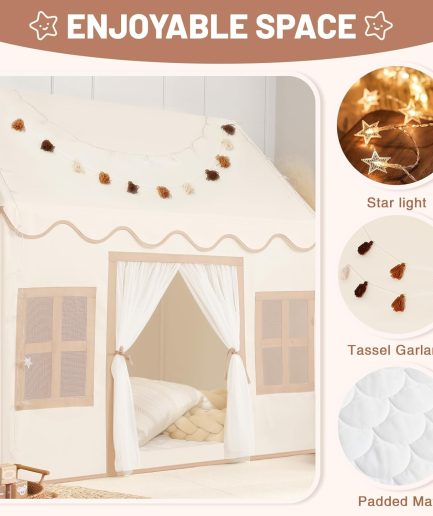 • Kid Tent with Mat, Star Lights - Kids Play Tents for Toddlers Kids Tents Indoor Playhouse - Princess Tent for Girls Toy House Gift (Beige with Mesh)New